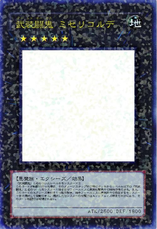 「武装闘鬼」と名のついたレベル5モンスター×2 このカードが戦闘を行った場合、そのダメージステップ終了時にデッキからレベル4以下の「武装闘鬼」と名のついたモンスター1体を自分フィールド上に表側攻撃表示で特殊召喚できる。また、このカードのエクシーズ素材を1つ取り除き、相手フィールド上に表側表示で存在するモンスター1体を選択して発動できる。選択したモンスターの攻撃力はエンドフェイズ時まで半分になり、そのターン戦闘では破壊されない。 |
