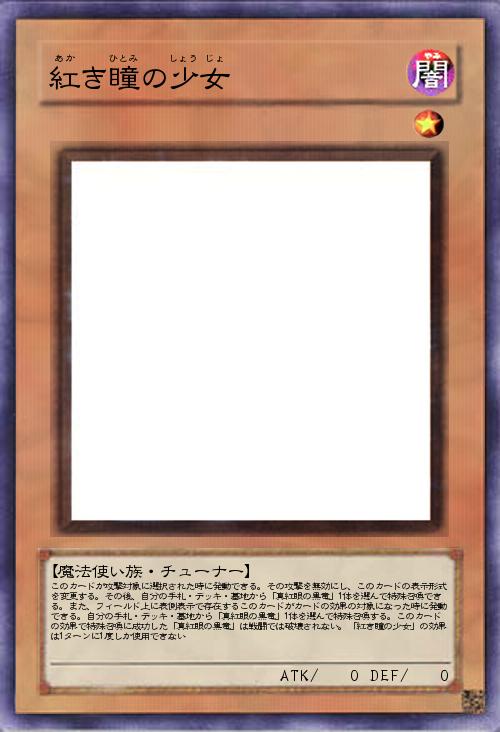| このカードが攻撃対象に選択された時に発動できる。その攻撃を無効にし、このカードの表示形式を変更する。その後、自分の手札・デッキ・墓地から「真紅眼の黒竜」1体を選んで特殊召喚できる。また、フィールド上に表側表示で存在するこのカードがカードの効果の対象になった時に発動できる。自分の手札・デッキ・墓地から「真紅眼の黒竜」1体を選んで特殊召喚する。このカードの効果で特殊召喚に成功した「真紅眼の黒竜」は戦闘では破壊されない。「紅き瞳の少女」の効果は1ターンに1度しか使用できない | |||