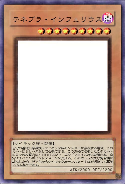| 自分の墓地に闇属性・サイキック族モンスターが存在する場合、このカードはリリースなしで召喚できる。この方法で召喚したこのカードの元々の攻撃力は1000になり、エンドフェイズ時に破壊され、自分は1000ポイントダメージを受ける。このカードが生け贄召喚に成功した時、デッキからサイキック族モンスター1体を選択して墓地に送る事ができる。 | |||