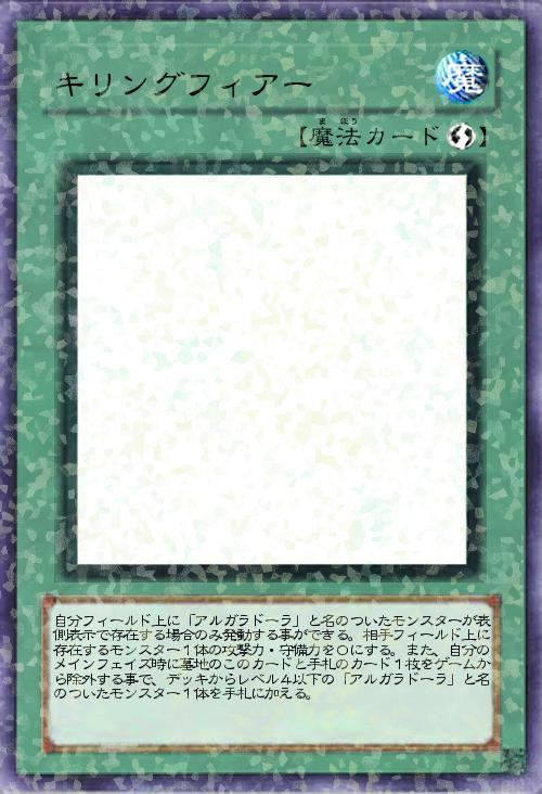 | 自分フィールド上に「アルガラドーラ」と名のついたモンスターが表側表示で存在する場合のみ発動する事ができる。相手フィールド上に存在するモンスター1体の攻撃力・守備力を0にする。また、自分のメインフェイズ時に墓地のこのカードと手札のカード1枚をゲームから除外する事で、デッキからレベル4以下の「アルガラドーラ」と名のついたモンスター1体を手札に加える。 | |||