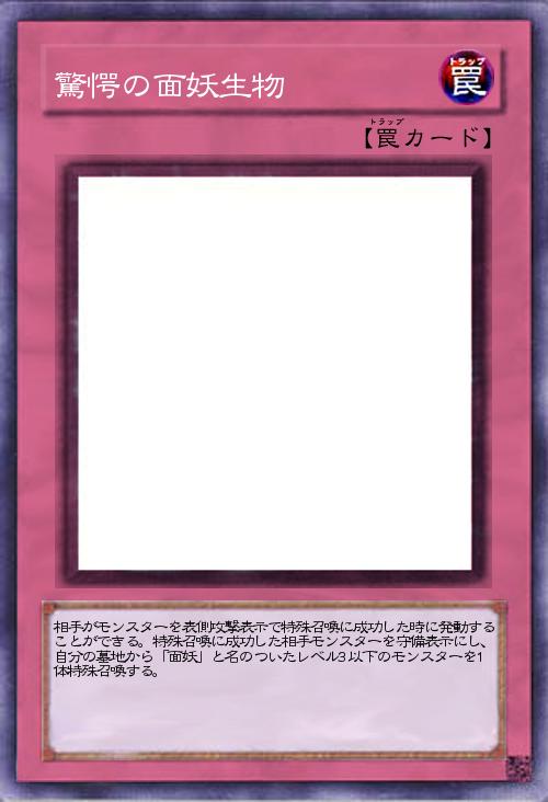 | 相手がモンスターを表側攻撃表示で特殊召喚に成功した時に発動することができる。特殊召喚に成功した相手モンスターを守備表示にし、自分の墓地から「面妖」と名のついたレベル3以下のモンスターを1体特殊召喚する。 | |||
