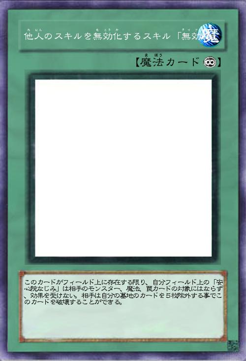 | このカードがフィールド上に存在する限り、自分フィールド上の「安心院なじみ」は相手のモンスター、魔法、罠カードの対象にはならず、効果を受けない。相手は自分の墓地のカードを5枚除外する事でこのカードを破壊することができる。 | |||