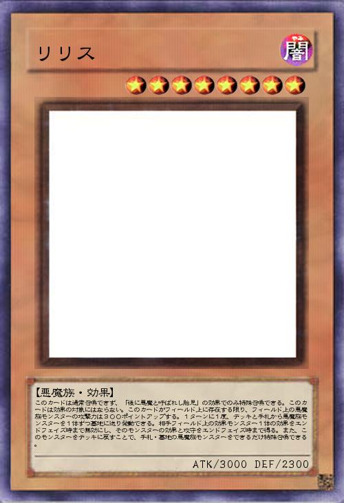 | このカードは通常召喚できず、「後に悪魔と呼ばれし胎児」の効果でのみ特殊召喚できる。このカードは効果の対象にはならない。このカードがフィールド上に存在する限り、フィールド上の悪魔族モンスターの攻撃力は300ポイントアップする。1ターンに1度、デッキと手札から悪魔族モンスターを1体ずつ墓地に送り発動できる。相手フィールド上の効果モンスター1体の効果をエンドフェイズ時まで無効にし、そのモンスターの効果と攻守をエンドフェイズ時まで得る。また、このモンスターをデッキに戻すことで、手札・墓地の悪魔族モンスターをできるだけ特殊召喚できる。 | |||