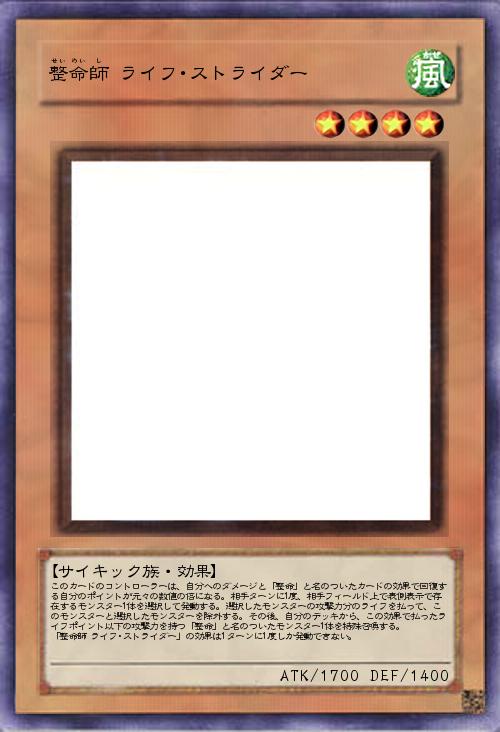 このカードのコントローラーは、自分へのダメージと「整命」と名のついたカードの効果で回復する自分のポイントが元々の数値の倍になる。相手ターンに1度、相手フィールド上で表側表示で存在するモンスター1体を選択して発動する。選択したモンスターの攻撃力分のライフを払って、このモンスターと選択したモンスターを除外する。その後、自分のデッキから、この効果で払ったライフポイント以下の攻撃力を持つ「整命」と名のついたモンスター1体を特殊召喚する。 「整命師 ライフ・ストライダー」の効果は1ターンに1度しか発動できない。 |