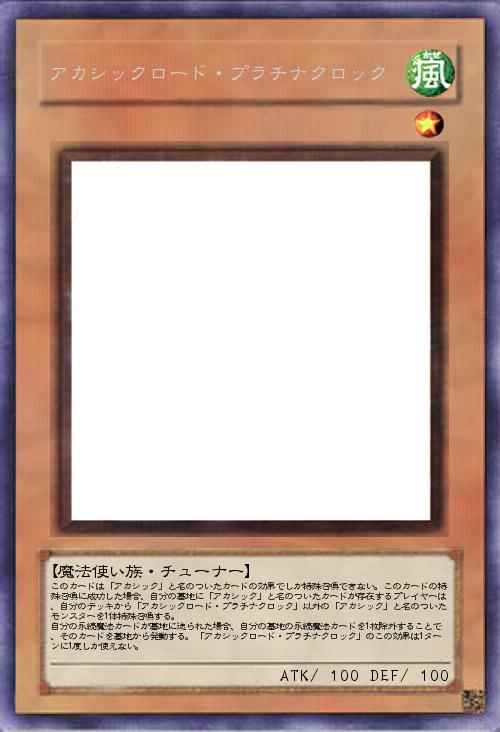 このカードは「アカシック」と名のついたカードの効果でしか特殊召喚できない。このカードの特殊召喚に成功した場合、自分の墓地に「アカシック」と名のついたカードが存在するプレイヤーは、自分のデッキから「アカシックロード・プラチナクロック」以外の「アカシック」と名のついたモンスターを1体特殊召喚する。 自分の永続魔法カードが墓地に送られた場合、自分の墓地の永続魔法カードを1枚除外することで、そのカードを墓地から発動する。「アカシックロード・プラチナクロック」のこの効果は1ターンに1度しか使えない。 |