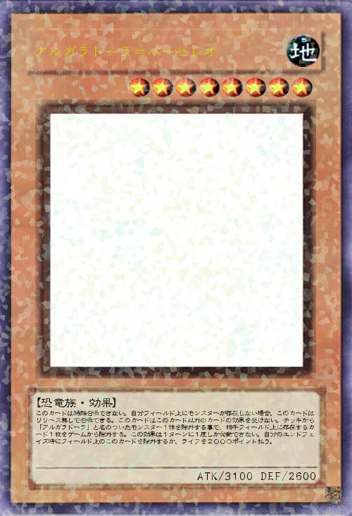 | このカードは特殊召喚できない。自分フィールド上にモンスターが存在しない場合、このカードはリリース無しで召喚できる。このカードはこのカード以外のカードの効果を受けない。デッキから「アルガラドーラ」と名のついたモンスター1体を除外する事で、相手フィールド上に存在するカード1枚をゲームから除外する。この効果は1ターンに1度しか発動できない。自分のエンドフェイズ時にフィールド上のこのカードを除外するか、ライフを2000ポイント払う。 | |||