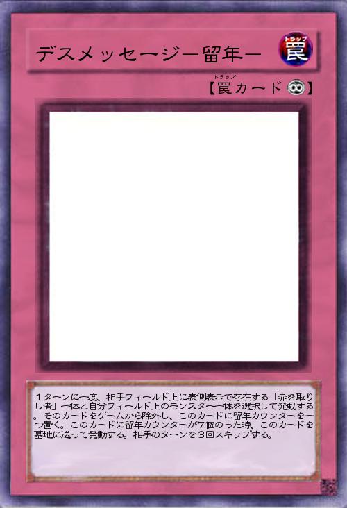 | 1ターンに一度、相手フィールド上に表側表示で存在する「赤を取りし者」一体と自分フィールド上のモンスター一体を選択して発動する。そのカードをゲームから除外し、このカードに留年カウンターを一つ置く。このカードに留年カウンターが7個のった時、このカードを墓地に送って発動する。相手のターンを3回スキップする。 | |||