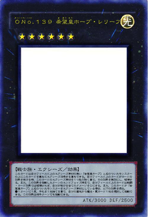 このカードは自分フィールド上のエクシーズ素材の無い「希望皇ホープ」と名のついたモンスターの上にこのカードを重ねてエクシーズ召喚する事もできる。自分フィールド上のカードがカードの効果を受ける時、このカードのエクシーズ素材を1つ取り除く事で、その効果を無効にし、破壊する。また、この効果を発動したターンのエンドフェイズ時まで、自分フィールド上のカードは戦闘・カード効果では破壊されず、自分が受ける全てのダメージを0にする。また、このカードが「希望皇ホープ」と名のついたモンスターをエクシーズ素材としている場合、以下の効果を得る。 ●1ターンに1度、手札を1枚捨てる事で、自分の墓地から魔法・罠カード1枚を選択して発動できる。この効果は相手ターンでも発動できる。 |