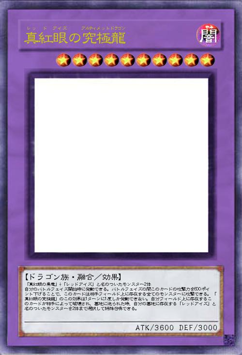 「真紅眼の黒竜」+「レッドアイズ」と名のついたモンスター2体 自分のバトルフェイズ開始時に発動できる。バトルフェイズの間このカードの攻撃力を600ポイント下げることで、このカードは相手フィールド上に存在する全てのモンスターに攻撃できる。「真紅眼の究極龍」のこの効果は1ターンに1度しか発動できない。自分フィールド上に存在するこのカードが相手によって破壊され、墓地に送られた時、自分の墓地に存在する「レッドアイズ」と名のついたモンスターを2体まで選択して特殊召喚できる。 |
