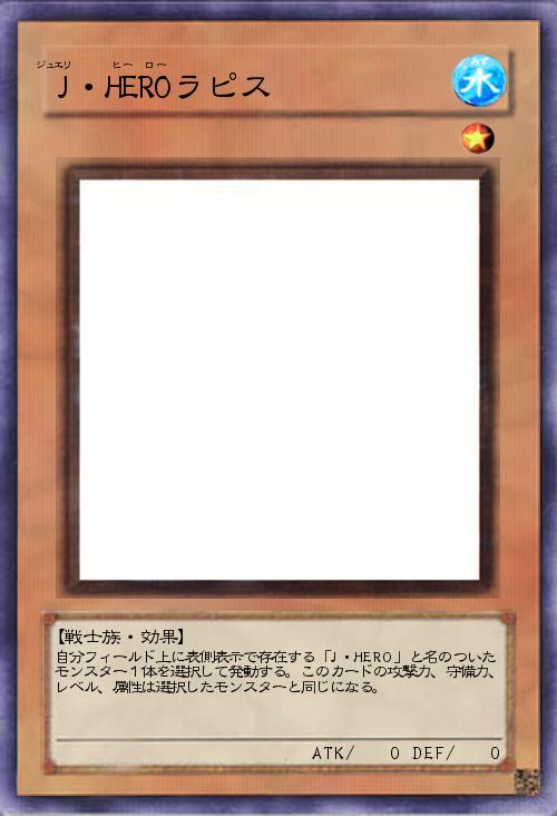 | 自分フィールド上に表側表示で存在する「J・HERO」と名のついたモンスター1体を選択して発動する。このカードの攻撃力、守備力、レベル、属性は選択したモンスターと同じになる。 | |||
