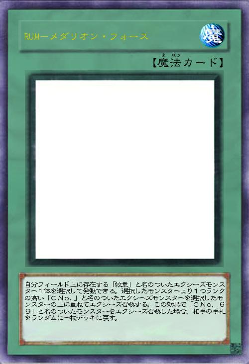 | 自分フィールド上に存在する「紋章」と名のついたエクシーズモンスター1体を選択して発動できる。選択したモンスターより1つランクの高い「CNo.」と名のついたエクシーズモンスターを選択したモンスターの上に重ねてエクシーズ召喚する。この効果で「CNo.69」と名のついたモンスターをエクシーズ召喚した場合、相手の手札をランダムに一枚デッキに戻す。 | |||