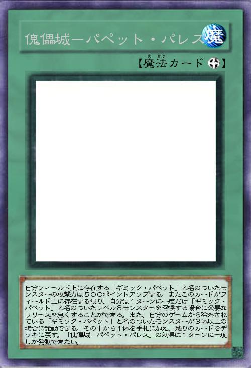 | 自分フィールド上に存在する「ギミック・パペット」と名のついたモンスターの攻撃力は500ポイントアップする。またこのカードがフィールド上に存在する限り、自分は1ターンに一度だけ「ギミック・パペット」と名のついたレベル8モンスターを召喚する場合に必要なリリースを無くすることができる。また、自分のゲームから除外されている「ギミック・パペット」と名のついたモンスターが3体以上の場合に発動できる。その中から1体を手札に加え、残りのカードをデッキに戻す。「傀儡城-パペット・パレス」の効果は1ターンに一度しか発動できない。 | |||
