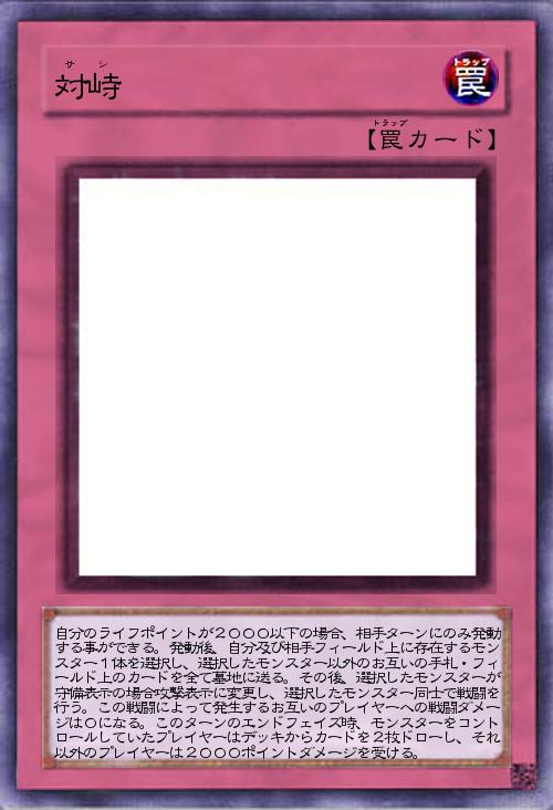 | 自分のライフポイントが2000以下の場合、相手ターンにのみ発動する事ができる。発動後、自分及び相手フィールド上に存在するモンスター1体を選択し、選択したモンスター以外のお互いの手札・フィールド上のカードを全て墓地に送る。その後、選択したモンスターが守備表示の場合攻撃表示に変更し、選択したモンスター同士で戦闘を行う。この戦闘によって発生するお互いのプレイヤーへの戦闘ダメージは0になる。このターンのエンドフェイズ時、モンスターをコントロールしていたプレイヤーはデッキからカードを2枚ドローし、それ以外のプレイヤーは2000ポイントダメージを受ける。 | |||