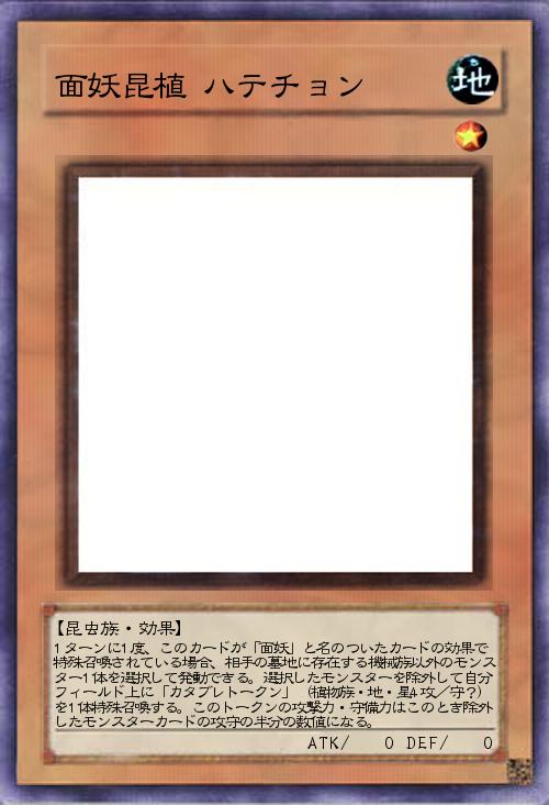 | 1ターンに1度、このカードが「面妖」と名のついたカードの効果で特殊召喚されている場合、相手の墓地に存在する機械族以外のモンスター1体を選択して発動できる。選択したモンスターを除外して自分フィールド上に「カタブレトークン」(植物族・地・星4攻/守?)を1体特殊召喚する。このトークンの攻撃力・守備力はこのとき除外したモンスターカードの攻守の半分の数値になる。 | |||