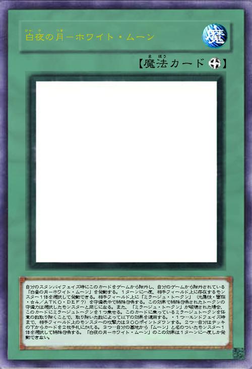 | 自分のスタンバイフェイズ時にこのカードをゲームから除外し、自分のゲームから除外されている「白昼の月-ホワイト・ムーン」を発動する。1ターンに一度、相手フィールド上に存在するモンスター1体を選択して発動できる。相手フィールド上に「ミラージュ・トークン」(光属性・雷族・☆4/ATK0・DEF?)を守備表示で特殊召喚する。この効果で特殊召喚されたトークンの守備力は選択したモンスターと同じになる。また、「ミラージュ・トークン」が破壊された場合、このカードにミラージュトークンを1つ乗せる。このカードに乗っているミラージュトークンを任意の数取り除くことで、取り除いた数によって以下の効果を適用する。・1つ…エンドフェイズ時まで、相手フィールド上のモンスターの攻撃力は300ポイントダウンする。2つ…自分はデッキの下からカードを2枚手札に加える。3つ…自分の墓地から「ムーン」と名のついたモンスター1体を選択 | |||