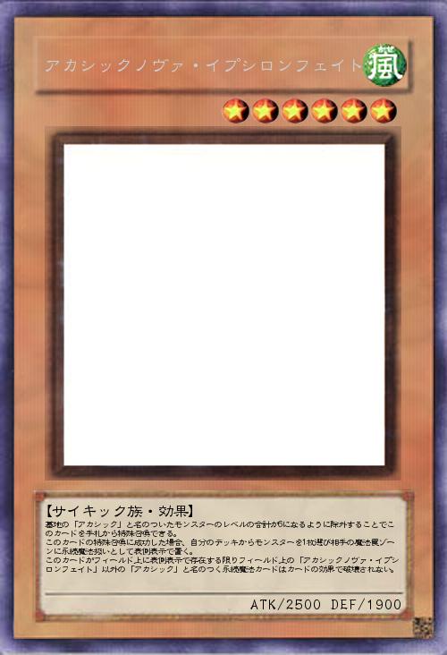 墓地の「アカシック」と名のついたモンスターのレベルの合計が6になるように除外することでこのカードを手札から特殊召喚できる。 このカードの特殊召喚に成功した場合、自分のデッキからモンスターを1枚選び相手の魔法罠ゾーンに永続魔法扱いとして表側表示で置く。 このカードがフィールド上に表側表示で存在する限りフィールド上の「アカシックノヴァ・イプシロンフェイト」以外の「アカシック」と名のつく永続魔法カードはカードの効果で破壊されない。 |