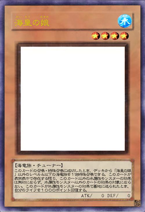| このカードの召喚・特殊召喚に成功したとき、デッキから「海皇の娘」以外のレベル4以下の海竜族を1体特殊召喚できる。このカードが表側表示で存在する限り、このカード以外の水属性モンスターの効果は無効にならず、水属性モンスター以外のカードの効果の対象にならない。このカードが水属性モンスターの効果で墓地に送られたとき、自分のライフを1000ポイント回復する。 | |||