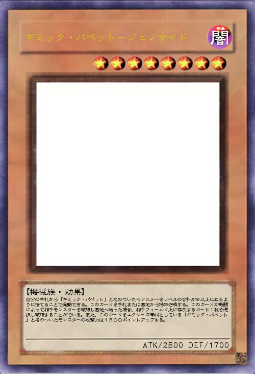 | 自分の手札から「ギミック・パペット」と名のついたモンスターをレベルの合計が9以上になるように捨てることで発動できる。このカードを手札または墓地から特殊召喚する。このカードが戦闘によって相手モンスターを破壊し墓地へ送った場合、相手フィールド上に存在するカード1枚を選択し破壊することがでいる。また、このカードをエクシーズ素材としている「ギミック・パペット」と名のついたモンスターの攻撃力は1500ポイントアップする。 | |||