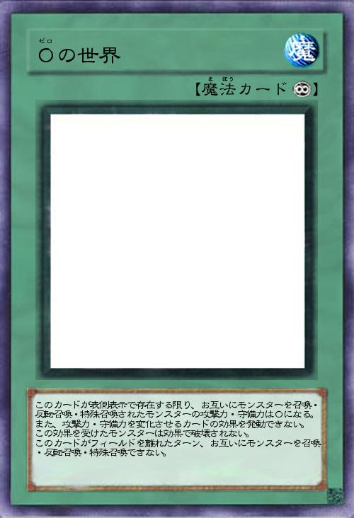 このカードが表側表示で存在する限り、お互いにモンスターを召喚・反転召喚・特殊召喚されたモンスターの攻撃力・守備力は0になる。また、攻撃力・守備力を変化させるカードの効果を発動できない。 この効果を受けたモンスターは効果で破壊されない。 このカードがフィールドを離れたターン、お互いにモンスターを召喚・反転召喚・特殊召喚できない。 |