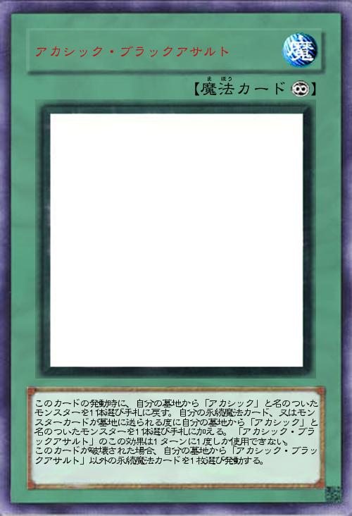 このカードの発動時に、自分の墓地から「アカシック」と名のついたモンスターを1体選び手札に戻す。自分の永続魔法カード、又はモンスターカードが墓地に送られる度に自分の墓地から「アカシック」と名のついたモンスターを1体選び手札に加える。「アカシック・ブラックアサルト」のこの効果は1ターンに1度しか使用できない。 このカードが破壊された場合、自分の墓地から「アカシック・ブラックアサルト」以外の永続魔法カードを1枚選び発動する。 |