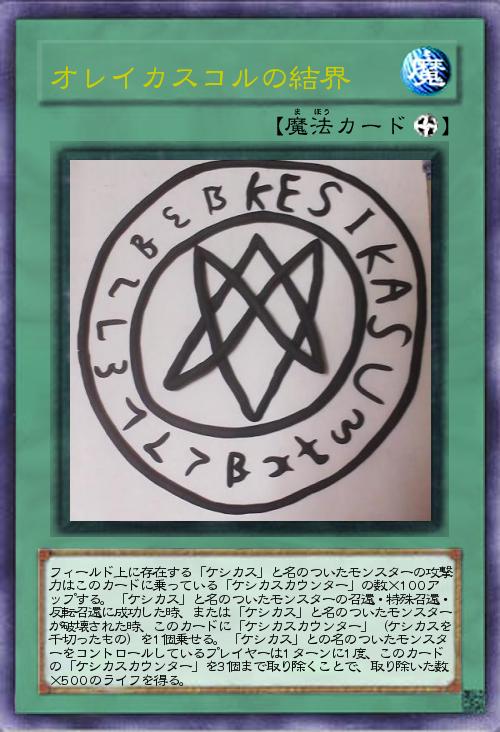 | フィールド上に存在する「ケシカス」と名のついたモンスターの攻撃力はこのカードに乗っている「ケシカスカウンター」の数×100アップする。「ケシカス」と名のついたモンスターの召還・特殊召還・反転召還に成功した時、または「ケシカス」と名のついたモンスターが破壊された時、このカードに「ケシカスカウンター」(ケシカスを千切ったもの)を1個乗せる。「ケシカス」との名のついたモンスターをコントロールしているプレイヤーは1ターンに1度、このカードの「ケシカスカウンター」を3個まで取り除くことで、取り除いた数×500のライフを得る。 | |||