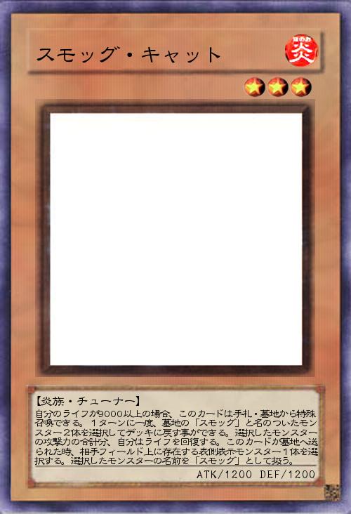 そしてすみまんせん。「スモッグ・キャットの効果は1ターンに一度しか使用できない」のテキストを書き忘れていました・・・; お二人共、指摘してくださってありがとうございます。キンドルさんの言うように、「デュエル中に一度しか発動できない」にしておきましょうか。キャノンソルジャーでの1キルがより強力な物になってしまいますからね。
