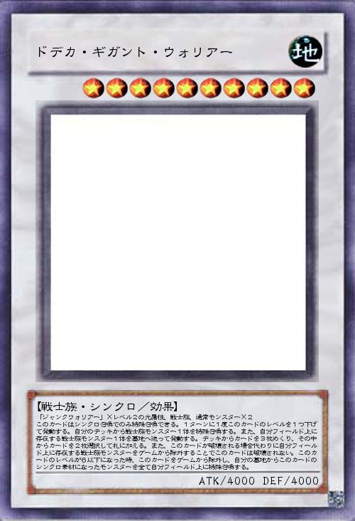 「すべてのシンクロモンスターにドデカ・ギガントをつけます。(レベルは10、攻守は4000、レベルがさがり、レベル6以下になったときシンクロ素材特殊召喚効果はおやくそくで付き添います。ってか絶対禁止ですねw)」(2013-07-13 17:39)