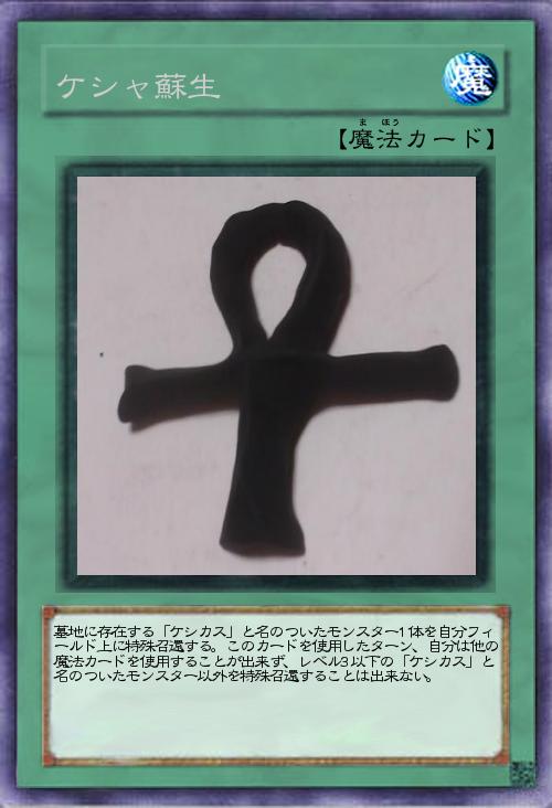 | 墓地に存在する「ケシカス」と名のついたモンスター1体を自分フィールド上に特殊召還する。このカードを使用したターン、自分は他の魔法カードを使用することが出来ず、レベル3以下の「ケシカス」と名のついたモンスター以外を特殊召還することは出来ない。 | |||