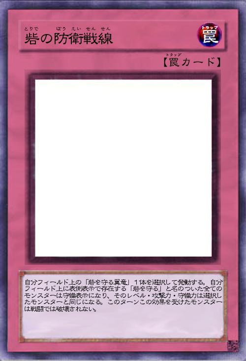 | 自分フィールド上の「砦を守る翼竜」1体を選択して発動する。自分フィールド上に表側表示で存在する「砦を守る」と名のついた全てのモンスターは守備表示になり、そのレベル・攻撃力・守備力は選択したモンスターと同じになる。このターンこの効果を受けたモンスターは戦闘では破壊されない。 | |||