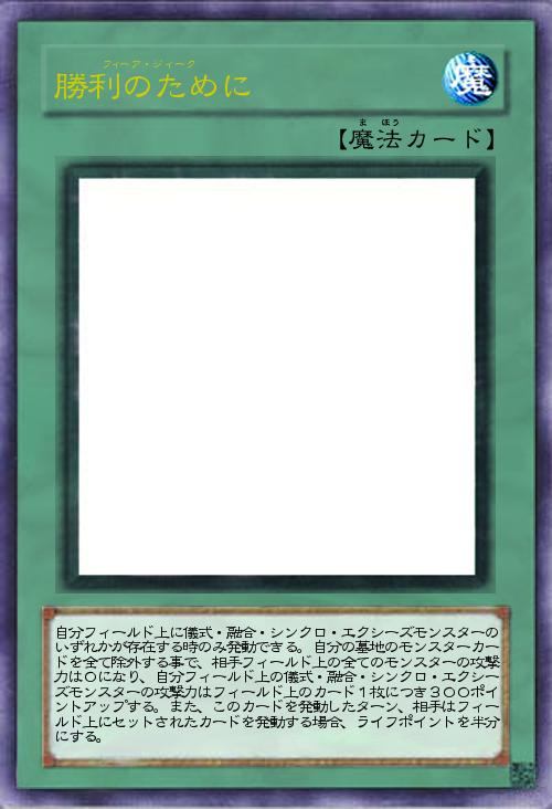 | 自分フィールド上に儀式・融合・シンクロ・エクシーズモンスターのいずれかが存在する時のみ発動できる。自分の墓地のモンスターカードを全て除外する事で、相手フィールド上の全てのモンスターの攻撃力は0になり、自分フィールド上の儀式・融合・シンクロ・エクシーズモンスターの攻撃力はフィールド上のカード1枚につき300ポイントアップする。また、このカードを発動したターン、相手はフィールド上にセットされたカードを発動する場合、ライフポイントを半分にする。 | |||