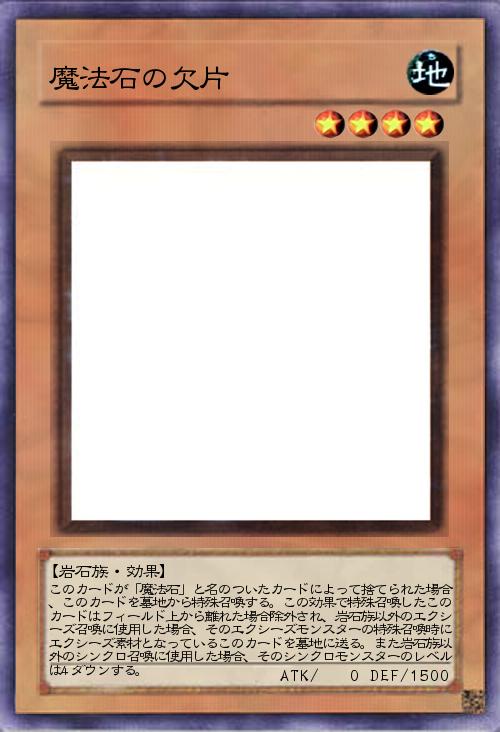 | このカードが「魔法石」と名のついたカードによって捨てられた場合、このカードを墓地から特殊召喚する。この効果で特殊召喚したこのカードはフィールド上から離れた場合除外され、岩石族以外のエクシーズ召喚に使用した場合、そのエクシーズモンスターの特殊召喚時にエクシーズ素材となっているこのカードを墓地に送る。また岩石族以外のシンクロ召喚に使用した場合、そのシンクロモンスターのレベルは4ダウンする。 | |||
