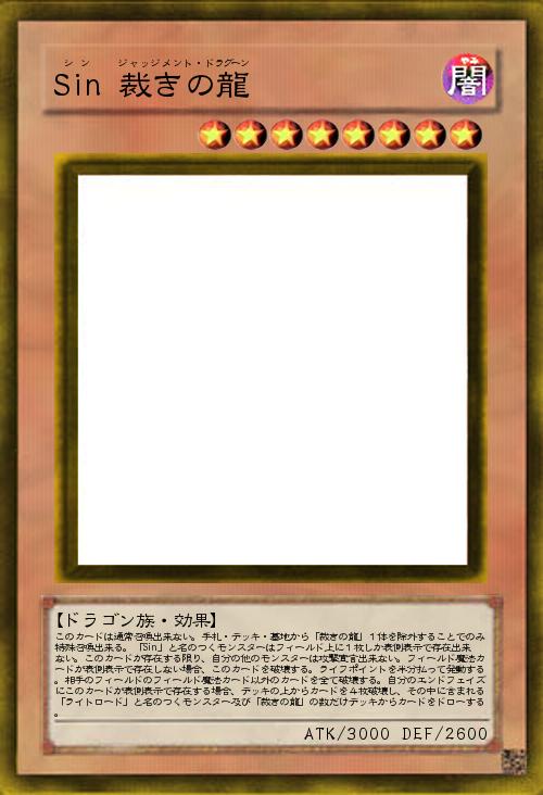 | このカードは通常召喚出来ない。手札・デッキ・墓地から「裁きの龍」1体を除外することでのみ特殊召喚出来る。「Sin」と名のつくモンスターはフィールド上に1枚しか表側表示で存在出来ない。このカードが存在する限り、自分の他のモンスターは攻撃宣言出来ない。フィールド魔法カードが表側表示で存在しない場合、このカードを破壊する。ライフポイントを半分払って発動する。相手のフィールドのフィールド魔法カード以外のカードを全て破壊する。自分のエンドフェイズにこのカードが表側表示で存在する場合、デッキの上からカードを4枚破壊し、その中に含まれる「ライトロード」と名のつくモンスター及び「裁きの龍」の数だけデッキからカードをドローする。 | |||