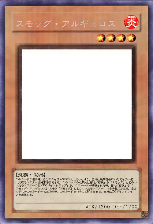 | このカードが召喚時、自分のライフが10000以上だった場合、自分は通常召喚に加えてもう一度、炎族モンスターを通常召喚できる。このカードの攻撃力は墓地に存在する「スモッグ」と名のついたモンスターの数×100ポイントアップする。このカードが破壊された時、墓地に存在する「スモッグ・アルギュロス」以外の「スモッグ」と名のついたモンスター1体を手札に加える。自分の手札がこのカード一枚だけの時、このカードを相手に公開する事で、自分は600ポイントライフを回復する。 | |||
