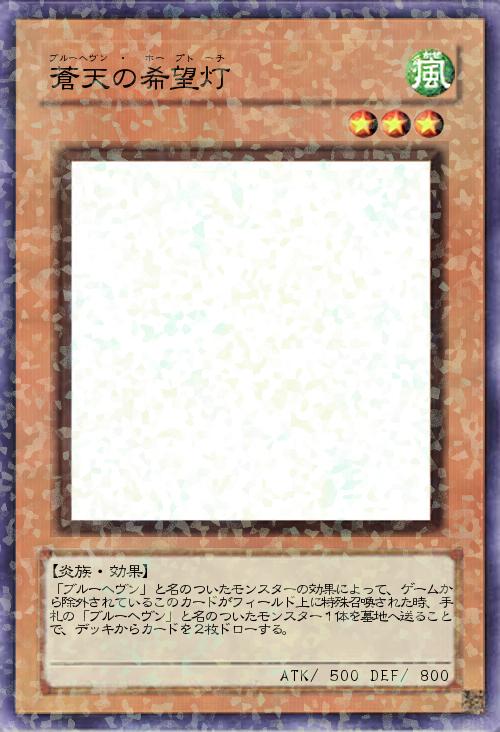 | 「ブルーヘヴン」と名のついたモンスターの効果によって、ゲームから除外されているこのカードがフィールド上に特殊召喚された時、手札の「ブルーヘヴン」と名のついたモンスター1体を墓地へ送ることで、デッキからカードを2枚ドローする。 | |||