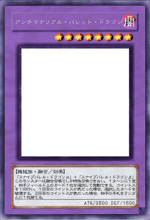 「スナイプバレル・ドラゴンα」+「スナイプバレル・ドラゴンβ」 このモンスターは融合召喚でしか特殊召喚できない。1ターンに1度、相手フィールド上のカード1枚を選択して発動できる。コイントスを1回行い、1回目のコイントスが表だった場合、選択したカードを破壊する。2回目のコイントスが表だった場合、相手の手札をランダムに1枚捨てる。 |
