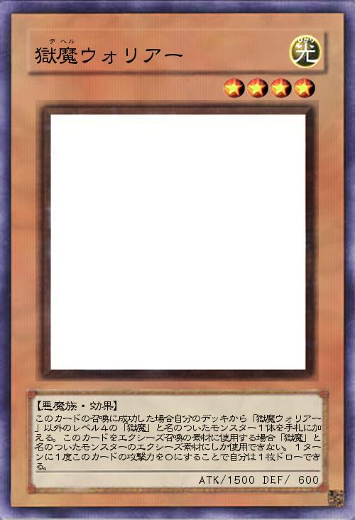 | このカードの召喚に成功した場合自分のデッキから「獄魔ウォリアー」以外のレベル4の「獄魔」と名のついたモンスター1体を手札に加える。このカードをエクシーズ召喚の素材に使用する場合「獄魔」と名のついたモンスターのエクシーズ素材にしか使用できない。1ターンに1度このカードの攻撃力を0にすることで自分は1枚ドローできる。 | |||