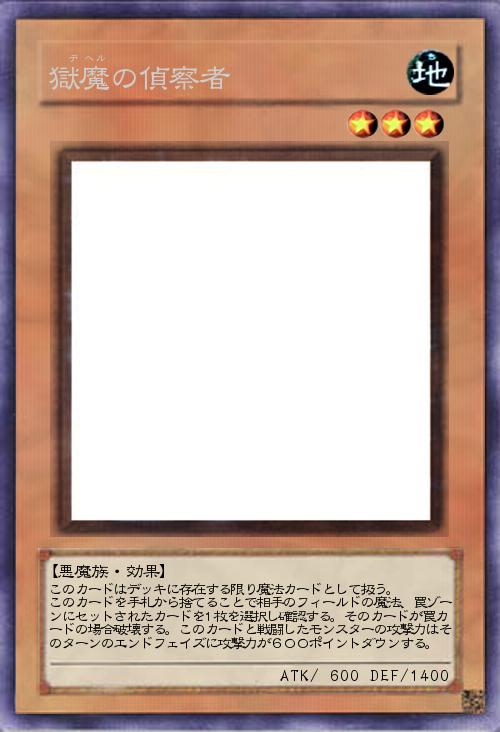 「獄魔のレベル3第2弾。さらにデッキで魔法に化けるので獄魔の配達者の効果を受けることもできる。まあ偵察者といっても異次元の偵察機のように除外されても帰還する効果はないので配達者の除外効果と自身の効果で帰還するというコンボできないけど。魔法に化ける効果はどこかに潜入した時何かに隠れるようなイメージ。ヴァンパイアロード、レディなどの効果で魔法を選択されたときに墓地に送れるけどモンスターを選択選択されたときは墓地に送れません。また手札でも魔法のような効果の発動をします。フィールドでもあの青い狼の超劣化版となった効果を使えます。」(2013-07-22 21:47)