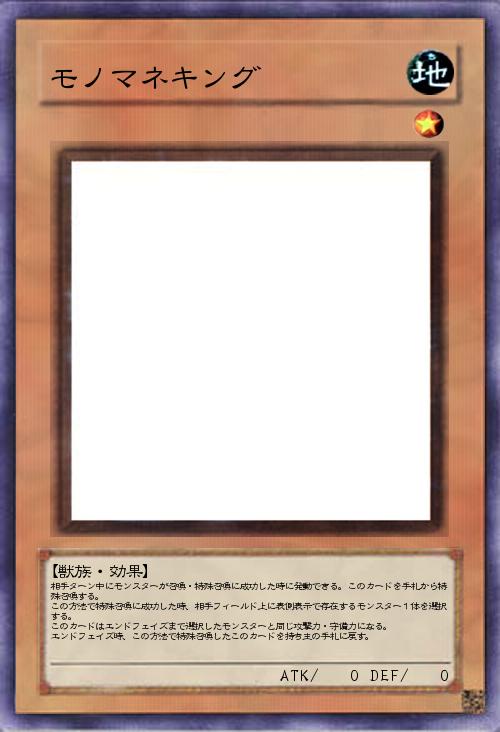 相手ターン中にモンスターが召喚・特殊召喚に成功した時に発動できる。このカードを手札から特殊召喚する。 この方法で特殊召喚に成功した時、相手フィールド上に表側表示で存在するモンスター1体を選択する。 このカードはエンドフェイズまで選択したモンスターと同じ攻撃力・守備力になる。 エンドフェイズ時、この方法で特殊召喚したこのカードを持ち主の手札に戻す。 |
