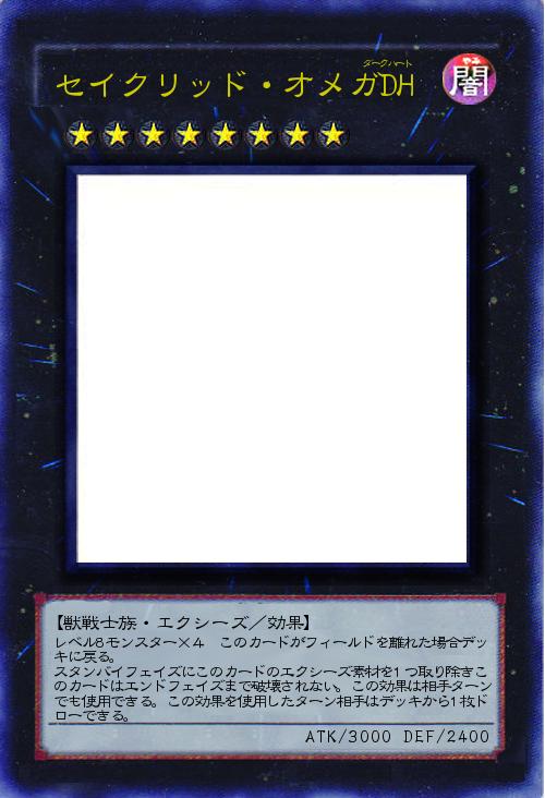 「聖なる光は闇に染まり不死の騎士が世界を地獄に叩き落す。アーマードダークハート!!いでよ「セイクリッド・オメガダークハート」(お笑い召喚台詞)正規召喚はできるだけ厳しくしたつもりです。「邪悪なる核 ダークハート」の効果で出せばほぼ永久に効果を使えます。逆に言うと「邪悪なる核 ダークハート」を墓地からどこかに移動させられると1度しか使えません。墓地送り、除外、バウンスくらいしか除去方法がないが除去しようとするとデッキに戻る。召喚ターンに何とか除去しましょう。相手はドロー権利を得るのでデッキ破壊ウイルスでドローするのを躊躇させるというやり方もあります。さらにデッキ破壊ウイルスで手札を見てからマインドクラッシュで除去ということも、、、。枚数がかかるコンボなのでなんともいえないでしょうか、、、?」(2013-07-25 18:30)