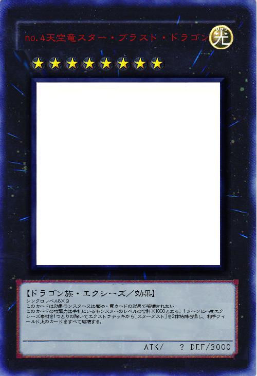 シンクロレベル8×3 このカードは効果モンスター又は魔法・罠カードの効果で破壊されない このカードの攻撃力は手札にいるモンスターのレベルの合計×1000となる。1ターンに一度エクシーズ素材を1つとりの除いてエクストラデッキから[スターダスト]を2体特殊召喚し、相手フィールド上のカードをすべて破壊する。 |