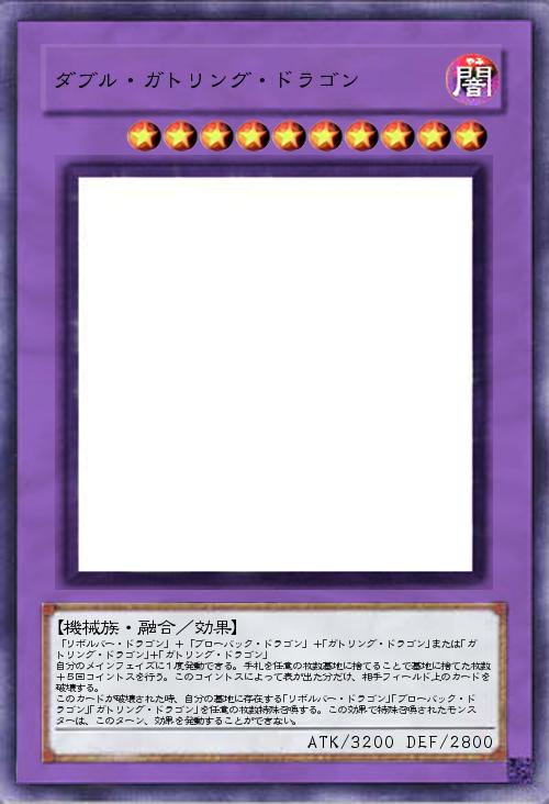 「リボルバー・ドラゴン」+「ブローバック・ドラゴン」+「ガトリング・ドラゴン」または「ガトリング・ドラゴン」+「ガトリング・ドラゴン」 自分のメインフェイズに1度発動できる。手札を任意の枚数墓地に捨てることで墓地に捨てた枚数+5回コイントスを行う。このコイントスによって表が出た分だけ、相手フィールド上のカードを破壊する。 このカードが破壊された時、自分の墓地に存在する「リボルバー・ドラゴン」「ブローバック・ドラゴン」「ガトリング・ドラゴン」を任意の枚数特殊召喚する。この効果で特殊召喚されたモンスターは、このターン、効果を発動することができない。 |