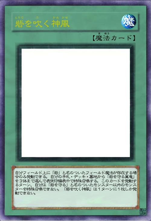 | 自分フィールド上に「砦」と名のついたフィールド魔法が存在する場合のみ発動できる。自分の手札・デッキ・墓地から「砦を守る翼竜」を3体まで選んで表側守備表示で特殊召喚する。このカードを発動するターン、自分は「砦を守る」と名のついたモンスター以外のモンスターを特殊召喚できない。「砦を吹く神風」は1ターンに1枚しか発動できない。 | |||