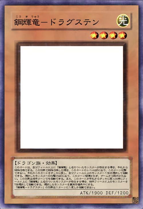 このカードは、自分フィールド上に「鋼輝竜」と名のついたモンスターが存在する場合、手札から特殊召喚できる。この効果で特殊召喚した場合、このカードのレベルは8になり、このターン攻撃できない。手札のこのカードをデッキに戻し、自分フィールド上のモンスター1体を選択して発動できる。選択したモンスターの攻撃力は0になり、このターン破壊されず、ゲームから除外されない。この効果は相手ターンでも発動できる。また、このカードが手札からデッキに戻った時にフィールド上に「鋼輝竜」と名のついたモンスターが存在する場合、相手フィールド上のモンスターを1体選択して発動できる。選択したモンスターを裏側守備表示にする。 「鋼輝竜-ドラグステン」の効果は1ターンに1度しか発動できない。 |