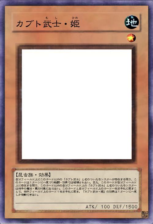 | 自分フィールド上にこのカード以外の「カブト武士」と名のついたモンスターが存在する限り、このカードは1ターンに一度づつ戦闘・効果では破壊されない。また、このカードが自分フィールド上に存在する限り、このカード以外の自分フィールド上の「カブト武士」と名のついたモンスターは相手の魔法・罠の対象にならない。このカードと自分フィールド上のカード一枚を手札に戻すことで、相手フィールド上のカード1枚を手札に戻す。「カブト武士・姫」の効果は1ターンに一度しか発動できない。 | |||