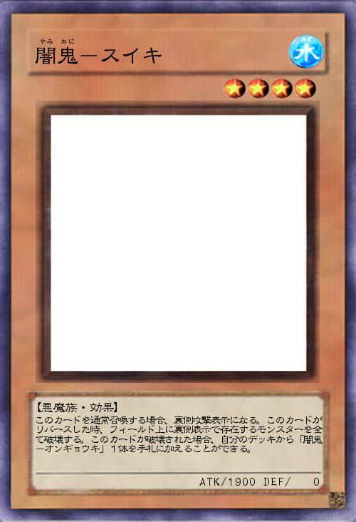 | このカードを通常召喚する場合、裏側攻撃表示になる。このカードがリバースした時、フィールド上に裏側表示で存在するモンスターを全て破壊する。このカードが破壊された場合、自分のデッキから「闇鬼-オンギョウキ」1体を手札に加えることができる。 | |||