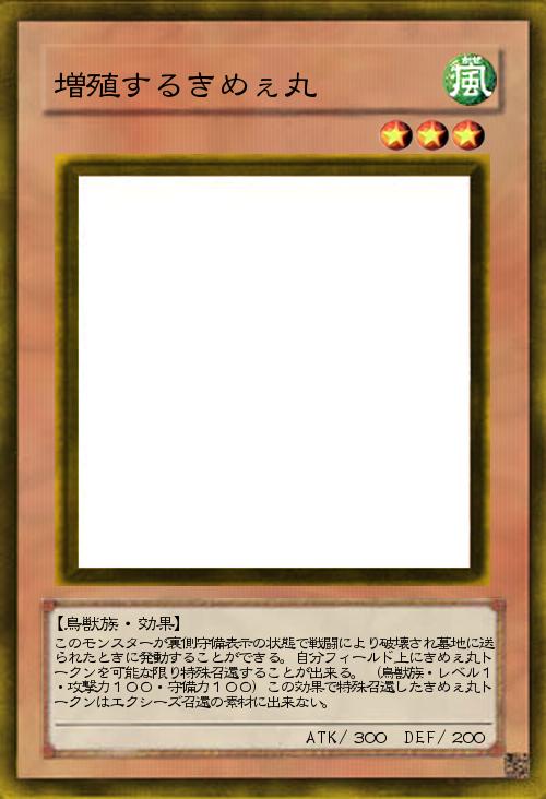 | このモンスターが裏側守備表示の状態で戦闘により破壊され墓地に送られたときに発動することができる。自分フィールド上にきめぇ丸トークンを可能な限り特殊召還することが出来る。(鳥獣族・レベル1・攻撃力100・守備力100)この効果で特殊召還したきめぇ丸トークンはエクシーズ召還の素材に出来ない。 | |||