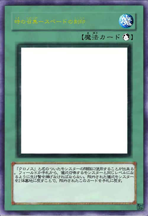 | 「クロノス」と名のついたモンスターの降臨に使用することが出来る。フィールドか手札から、儀式召喚するモンスターと同じレベルになるように生け贄を捧げなければならない。除外された儀式モンスターを2体墓地に戻すことで、除外されたこのカードを手札に戻す。 | |||