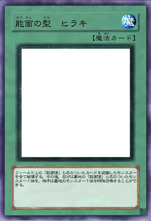 | フィールド上の「能面使」と名のついたカードを装備したモンスターを全て破壊する。その後、自分は墓地の「能面使」と名のついたモンスター1体を、相手は墓地のモンスター1体を特殊召喚することができる。 | |||