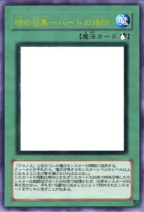 「クロノス」と名のついた儀式モンスターの降臨に使用する。 フィールドか手札から、儀式召喚するモンスターレベルのレベル以上になるように生け贄を捧げなければならない。 このカードの発動は無効にされずこのカードの効果で特殊召喚したモンスターは戦闘及びカードの効果で破壊されず、効果モンスターの効果を受けない。手札を1枚墓地に送ることによって除外されたこのカードをデッキに戻すことが出来る。 |