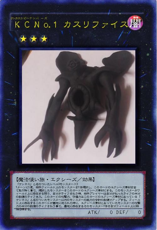 戦闘ダメージを痛み分け効果の代わりに、コイツがいる時に「ケシカス」を自身の効果で特殊召喚すると、相手は道ずれでライフ失う効果を付けました。」(2013-07-31 17:43)